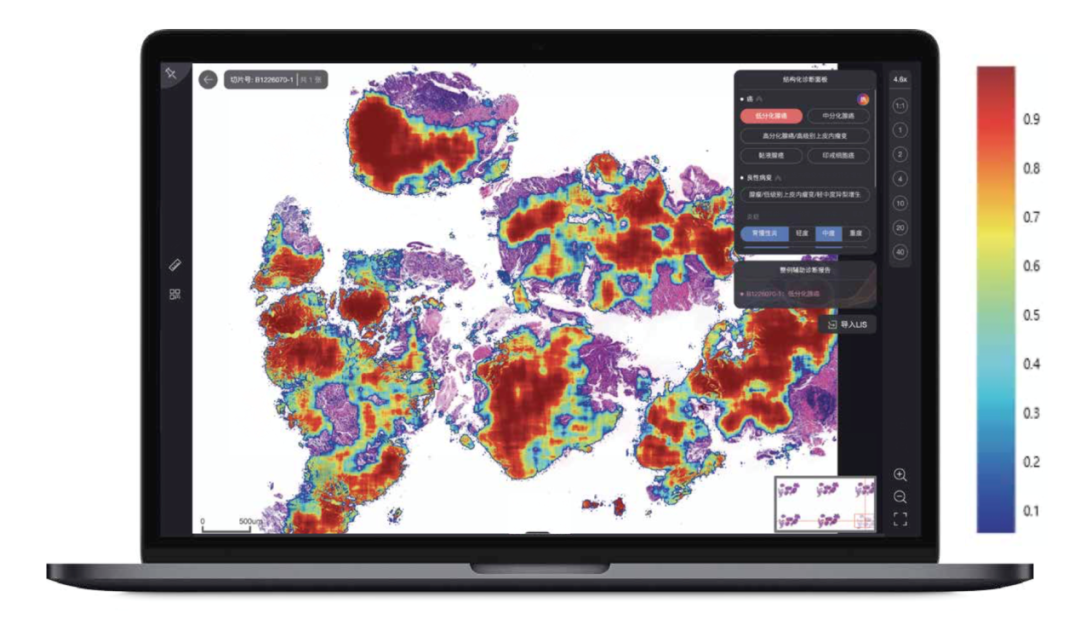 透徹影像建立了完整的AI基礎(chǔ)設(shè)施,ThoroughInsights®?中的胃部、腸部、前列腺、肺部惡性腫瘤識別模型能夠達(dá)到接近100%的切片級敏感度和超過80%的特異性,并能夠完成病變分型的識別,自動輸出結(jié)構(gòu)化診斷報告。