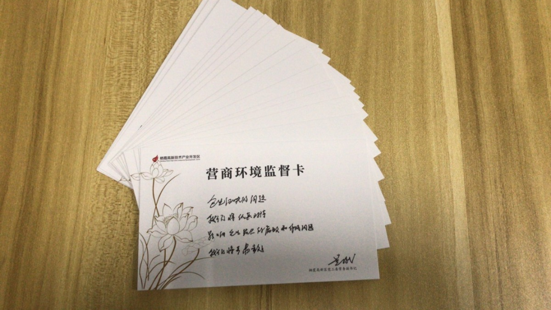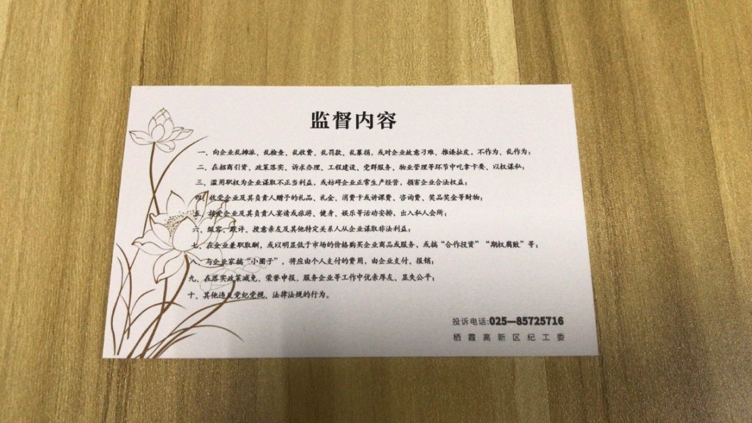監(jiān)督卡不僅公布監(jiān)督電話,還以“負(fù)面清單”形式對權(quán)力尋租、利益輸送、“吃拿卡要”等腐敗行為和不作為、慢作為、亂作為等作風(fēng)問題進行了重點提示。棲霞高新區(qū)通過全員走訪、服務(wù)窗口集中擺放等方式,已發(fā)放監(jiān)督卡400多張,企業(yè)在收到監(jiān)督卡后紛紛點贊。