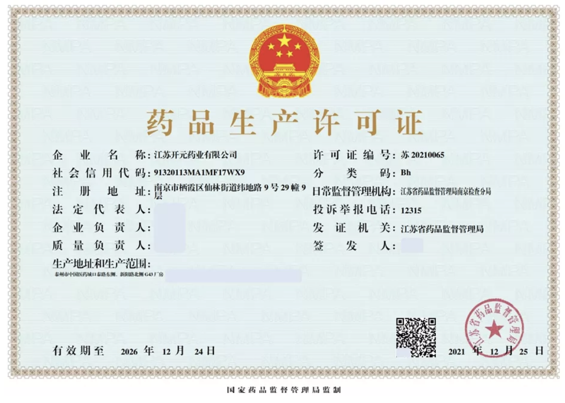 經過不懈努力,2021年12月25日,江蘇開元藥業(yè)有限公司順利獲得了由江蘇省藥品監(jiān)督管理局簽發(fā)的藥品研發(fā)機構作為上市持有人(MAH)的《藥品生產許可證》B證。