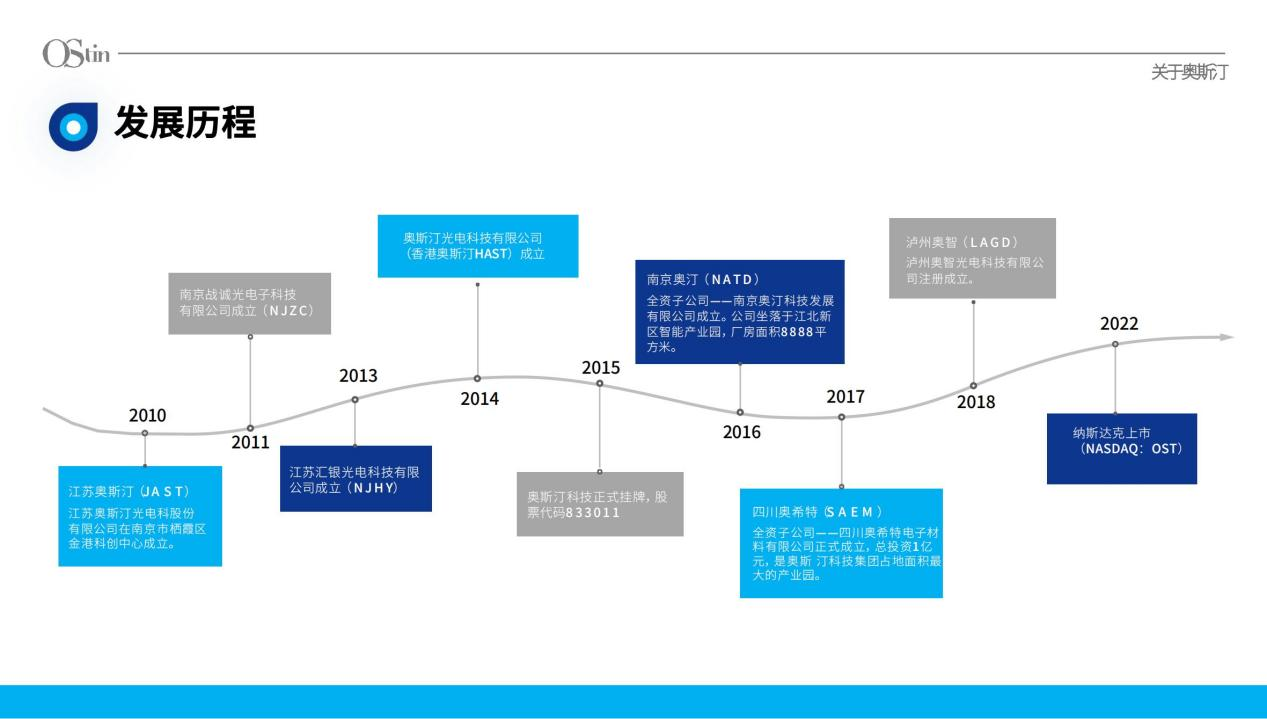 2010年12月,江蘇奧斯汀光電科技股份有限公司在南京棲霞高新區(qū)成立。2015年07月,掛牌新三板。2022年,納斯達(dá)克上市。經(jīng)過多年發(fā)展,奧斯汀科技現(xiàn)有4家工廠、7家分公司、6大體系。員工約300名,其中各類專家和技術(shù)人員60名,無塵廠房面積達(dá)到38000平方米。