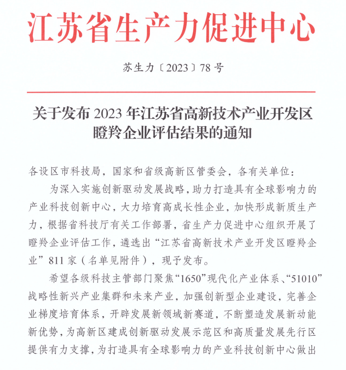 2023年入選江蘇潛在獨角獸和高新區(qū)瞪羚企業(yè)名單