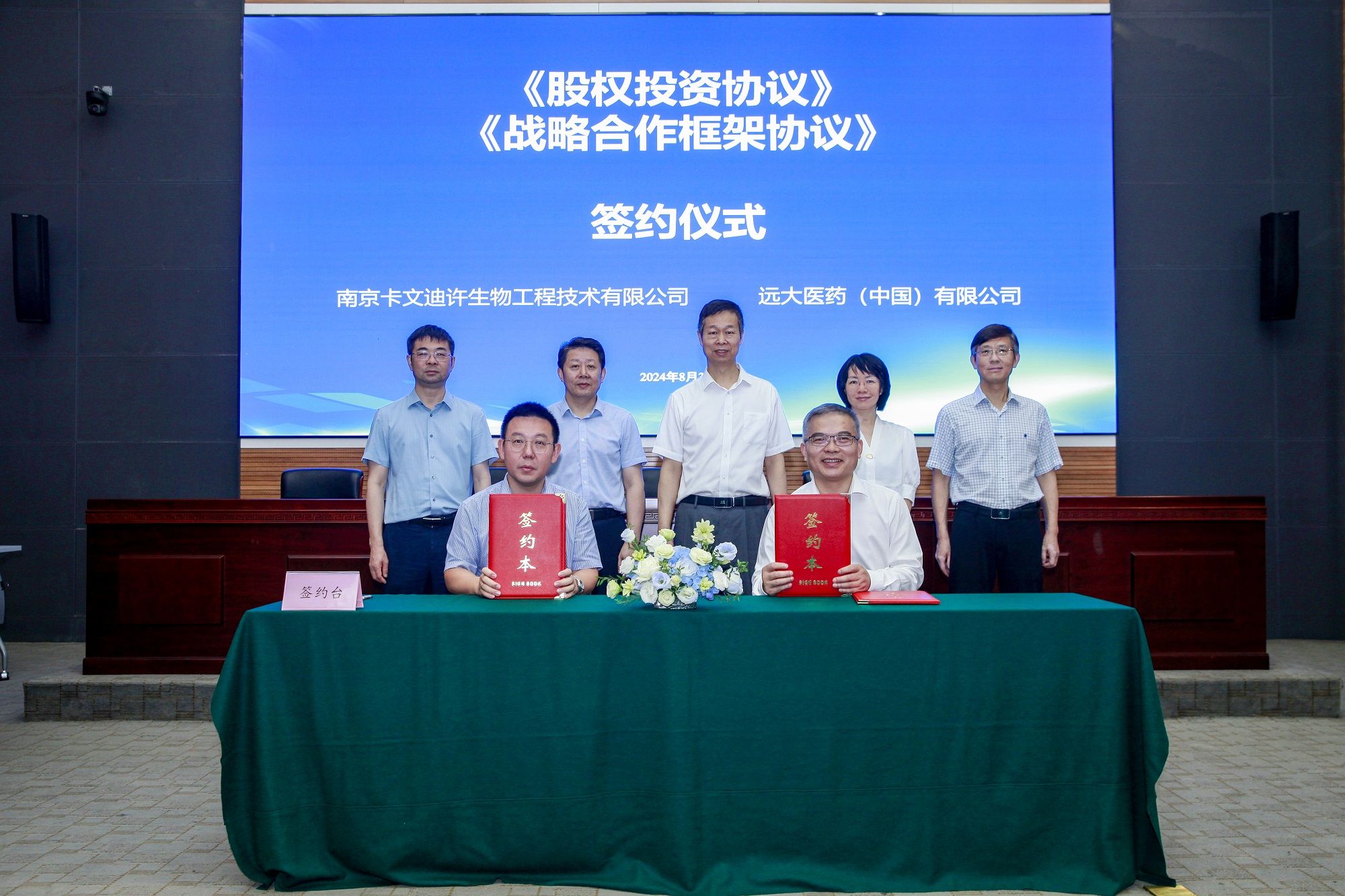 在朱飛鵬、郭昌標、章晶、黃斌、王俊的共同見證下,遠大醫(yī)藥(中國)有限公司董事局主席兼總裁唐緯坤與南京卡文迪許生物工程技術(shù)有限公司董事長許永翔各自代表遠大醫(yī)藥和卡文迪許完成戰(zhàn)略合作簽約。