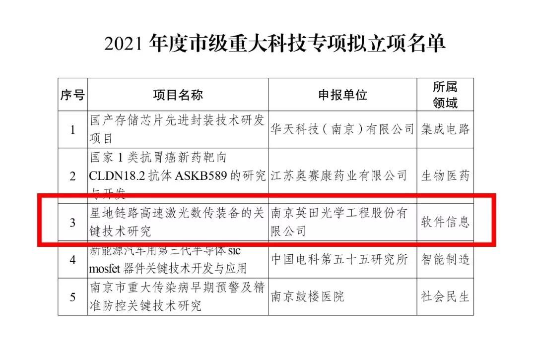 近年來(lái),江蘇南京一直以科技創(chuàng)新為核心,推動(dòng)“創(chuàng)新名城”建設(shè),2021年江蘇省南京市委“一號(hào)文”《關(guān)于新發(fā)展階段全面建設(shè)創(chuàng)新名城的若干政策措施》提出,促進(jìn)創(chuàng)新型領(lǐng)軍企業(yè)加快成長(zhǎng),在市委創(chuàng)新辦和市科技局主導(dǎo)下,聚焦以應(yīng)用為導(dǎo)向的基礎(chǔ)研究,重大產(chǎn)業(yè)科技創(chuàng)新、重大民生科技等領(lǐng)域,側(cè)重對(duì)重大技術(shù)系統(tǒng)、科技瓶頸性核心技術(shù)、關(guān)鍵零部件、重大高端裝備等集中系統(tǒng)攻關(guān)和重點(diǎn)突破,組織開展2021年度市級(jí)重大科技專項(xiàng)申報(bào)工作。圍繞軟件、信息服務(wù)和人工智能,新醫(yī)藥與生命健康,能源、交通和制造,集成電路,社會(huì)民生等領(lǐng)域,共有二百余家企業(yè)申請(qǐng)本次專項(xiàng)申報(bào),棲霞高新區(qū)企業(yè)英田光學(xué)作為衛(wèi)星通信領(lǐng)域的創(chuàng)新型企業(yè),憑借領(lǐng)先的技術(shù)創(chuàng)新能力、自主知識(shí)產(chǎn)權(quán)創(chuàng)造能力和企業(yè)綜合實(shí)力,所申報(bào)的“星地鏈路高速激光數(shù)傳裝備的關(guān)鍵技術(shù)研究”項(xiàng)目,經(jīng)市科技局評(píng)審認(rèn)定,被列為南京市首批五個(gè)重大科技專項(xiàng)之一。