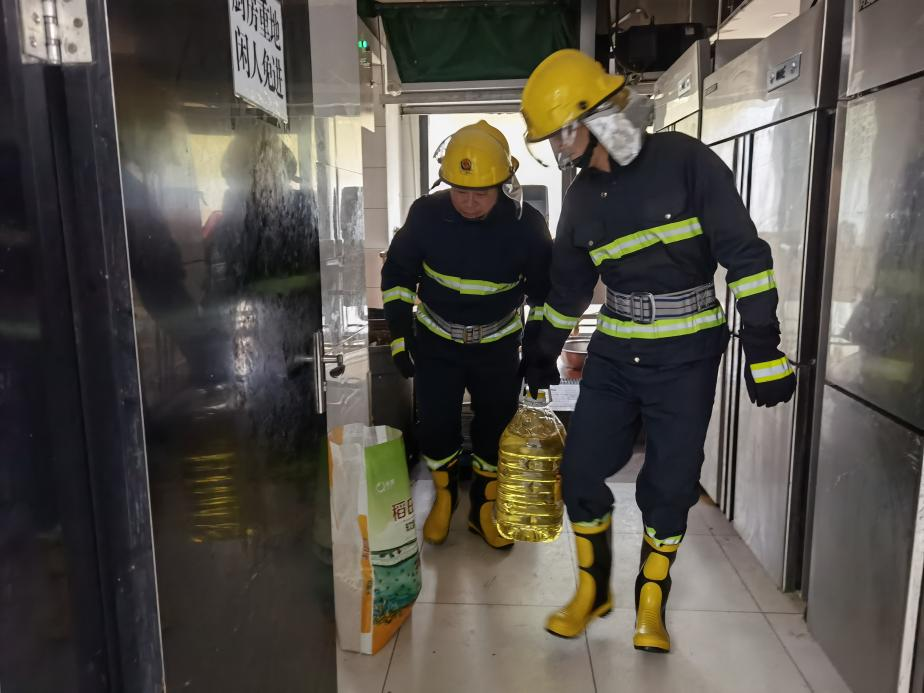 園區(qū)組織應急搶險,搶險滅火小組全副武裝趕赴現(xiàn)場,使用消防水帶、水槍等裝備對著火處實施打擊,移走廚房內(nèi)可燃物,切斷二層供電。