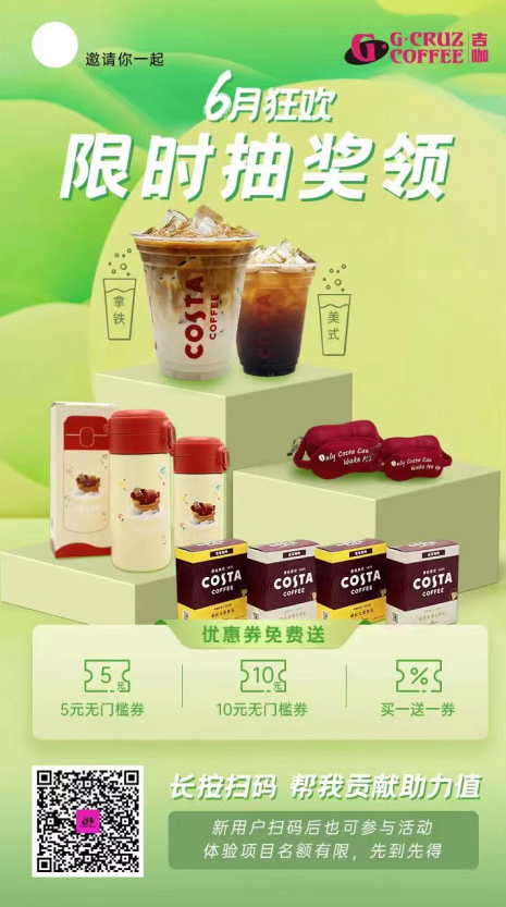 本次Costa推出6月狂歡活動(dòng),參加抽獎(jiǎng)活動(dòng)可得免費(fèi)咖啡還有更多優(yōu)惠券可以領(lǐng)取