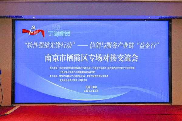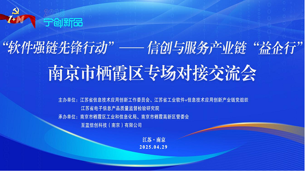 2025年4月29日下午,“寧創(chuàng)新品”板塊行——“軟件強(qiáng)鏈先鋒行動”信創(chuàng)與服務(wù)產(chǎn)業(yè)鏈“益企行”南京市棲霞區(qū)專場對接交流會在紫東生態(tài)會議中心成功舉辦。活動由江蘇省信息技術(shù)應(yīng)用創(chuàng)新工作委員會、江蘇省工業(yè)軟件+信息技術(shù)應(yīng)用創(chuàng)新產(chǎn)業(yè)鏈黨組織、江蘇省電子信息產(chǎn)品質(zhì)量監(jiān)督檢驗研究院主辦,南京市棲霞區(qū)工業(yè)和信息化局、棲霞高新區(qū)管委會、至藍(lán)信創(chuàng)科技(南京)有限公司聯(lián)合承辦。省工信廳軟件與信息服務(wù)業(yè)處一級調(diào)研員康成剛、省國家密碼局科技處二級調(diào)研員沈道鑒、省衛(wèi)健委規(guī)劃發(fā)展與信息化處二級主任科員韋小強(qiáng)、市工信局軟件與信息服務(wù)業(yè)處處長鄭煒、市國家密碼局科技發(fā)展處處長丁志斌、市數(shù)據(jù)局?jǐn)?shù)字基礎(chǔ)設(shè)施和數(shù)字科技處副處長杜忠焱、棲霞區(qū)工信局局長余蓉、棲霞高新區(qū)黨工委常務(wù)副書記楊靜等省、市、區(qū)領(lǐng)導(dǎo),以及50余家信創(chuàng)骨干企業(yè)及用戶單位出席本次活動,共商信創(chuàng)產(chǎn)業(yè)發(fā)展新路徑。本次會議由省信創(chuàng)工委會信創(chuàng)測試中心主任王坤主持。