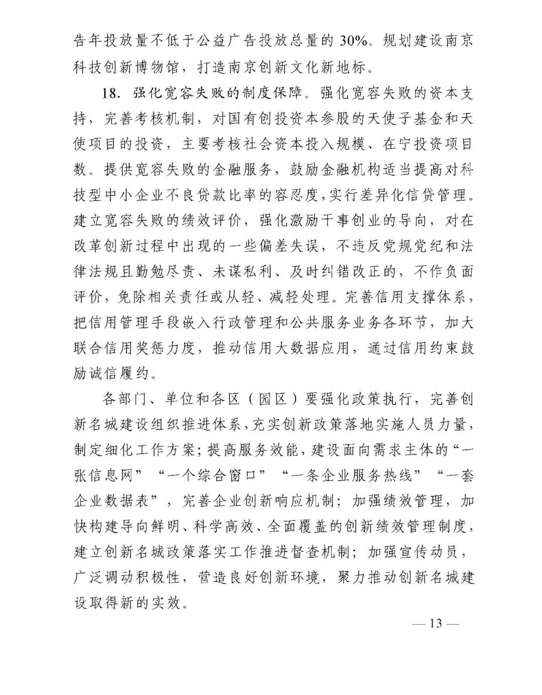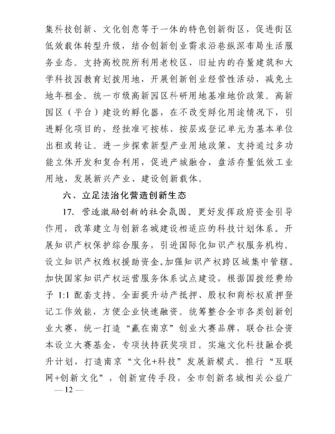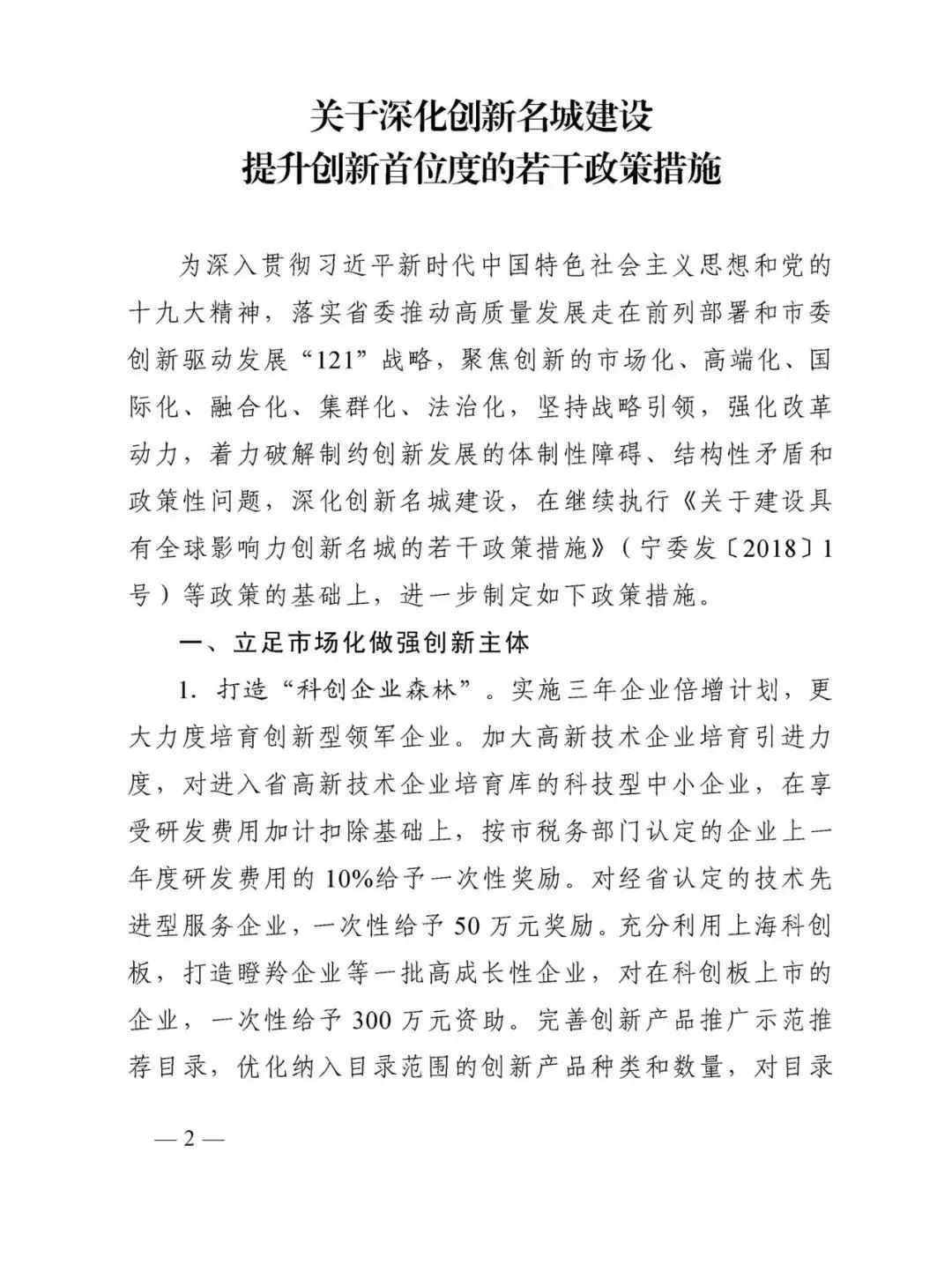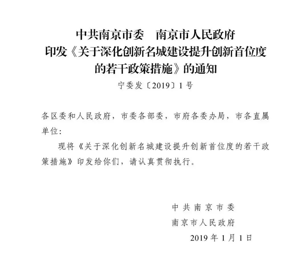 2019年元旦后上班第一天,南京創(chuàng)新名城建設(shè)推進大會在南京人民大會堂召開。會上發(fā)布了2019年南京市委一號文件《關(guān)于深化創(chuàng)新名城建設(shè)提升創(chuàng)新首位度的若干政策措施》。這是連續(xù)第二年,南京市委一號文件聚焦“創(chuàng)新名城”。據(jù)了解,2019年一號文,在執(zhí)行2018年一號文《關(guān)于建設(shè)具有全球影響力創(chuàng)新名城的若干政策措施》的基礎(chǔ)上,又出臺18項政策措施。今年的一號文件共六部分十八條,緊扣“深化創(chuàng)新名城建設(shè)”主題,主要是強化了“六化”導向,重點在市場化、高端化、國際化、融合化、集群化、法治化等方面,探索新的機制,形成新的支撐,打造更優(yōu)創(chuàng)新生態(tài)。