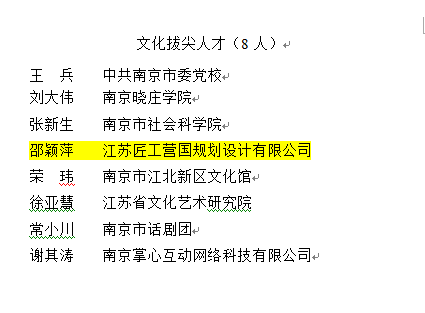 其中科技創(chuàng)新拔尖人才組1人梁露露(南京源堡科技研究院有限公司)、文化拔尖人才組棲霞區(qū)唯一1人邵穎萍(江蘇匠工營國規(guī)劃設(shè)計(jì)有限公司)。