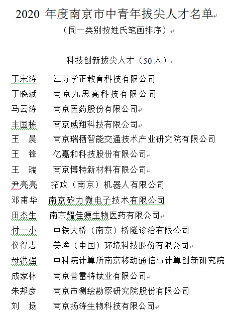 根據(jù)《南京市關(guān)于中青年拔尖人才選拔培養(yǎng)的實(shí)施辦法(修訂)》(寧委辦發(fā)〔2020〕1號(hào))等文件規(guī)定,經(jīng)評(píng)審,現(xiàn)確定2020年度南京市中青年拔尖人才111人。棲霞區(qū)確定入選南京市中青年拔尖人才10人,其中高新區(qū)2人。