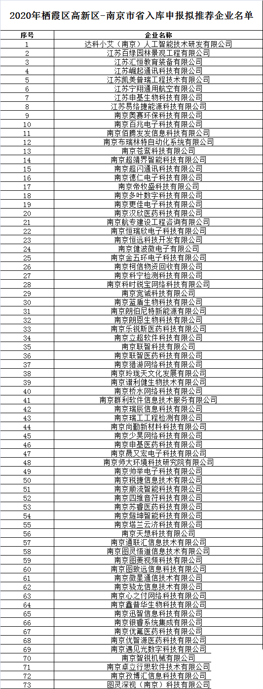 近日,棲霞高新區(qū)73家企業(yè)擬推薦入省高新技術(shù)企業(yè)培育庫。