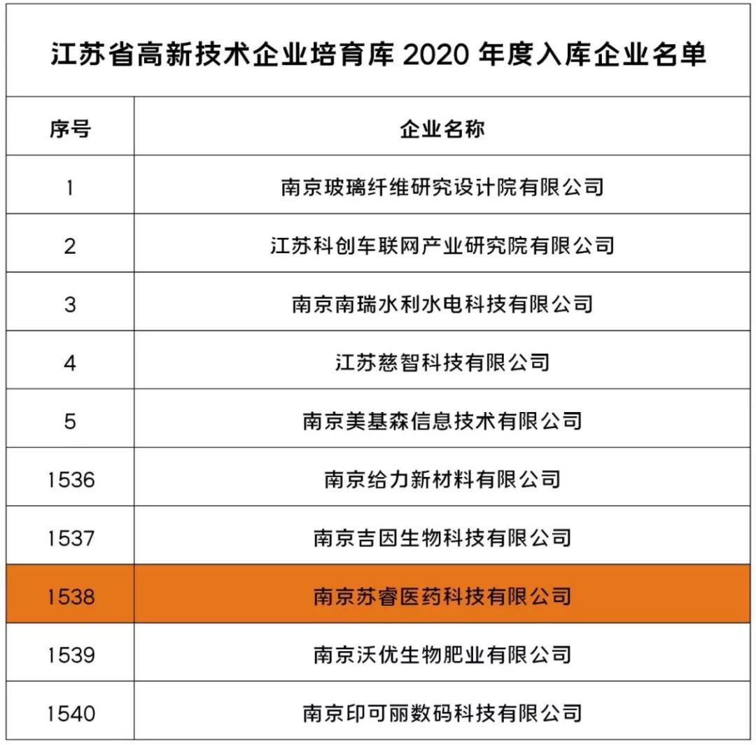 南京蘇睿醫(yī)藥科技有限公司成功入選2020年江蘇省高新技術(shù)企業(yè)培育庫(kù)。