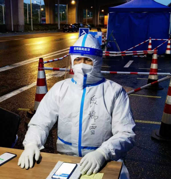在高速卡口現(xiàn)場,“卡口戰(zhàn)士”們24小時(shí)不間斷地進(jìn)行來寧司機(jī)的“兩碼”及核酸證明的查驗(yàn)、信息登記等工作。不管白天黑夜,不管烈日炎炎,不管刮風(fēng)下雨,殷瑞雪始終奮戰(zhàn)在抗疫一線,堅(jiān)定地履行職責(zé),從未有一句怨言。他的妻子是一名社區(qū)工作者,在每輪核酸檢測中都加班加點(diǎn),同時(shí)不停的核實(shí)大數(shù)據(jù)平臺外地返寧人員信息。疫情期間,夫妻倆陪伴孩子的時(shí)間少之又少。正因?yàn)樽约号惆檎疹櫟臅r(shí)間少,自己孩子比同齡人更加獨(dú)立懂事,他很欣慰但又覺得愧疚。