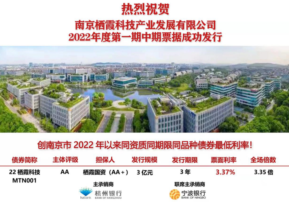 5月6日,棲霞高新區(qū)運(yùn)營主體南京棲霞科技產(chǎn)業(yè)發(fā)展有限公司3億元中期票據(jù)在銀行間債券市場公開發(fā)行,期限3年,票面利率3.37%,本次發(fā)行創(chuàng)2022年以來南京市同資質(zhì)同期限同品種債券最低利率。亦創(chuàng)棲霞高新區(qū)融資貸款以來同期限最低利率。