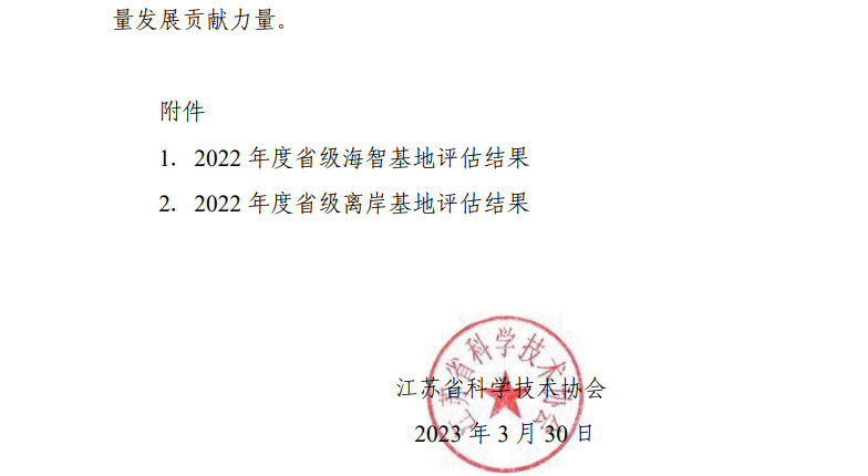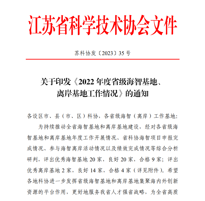 近日,江蘇省科協(xié)印發(fā)了《關于印發(fā)<2022年度省級海智基地、離岸基地工作情況>的通知》,南京棲霞海智基地在2022年度省級海智基地評估中獲評優(yōu)秀,連續(xù)三年獲此殊榮。