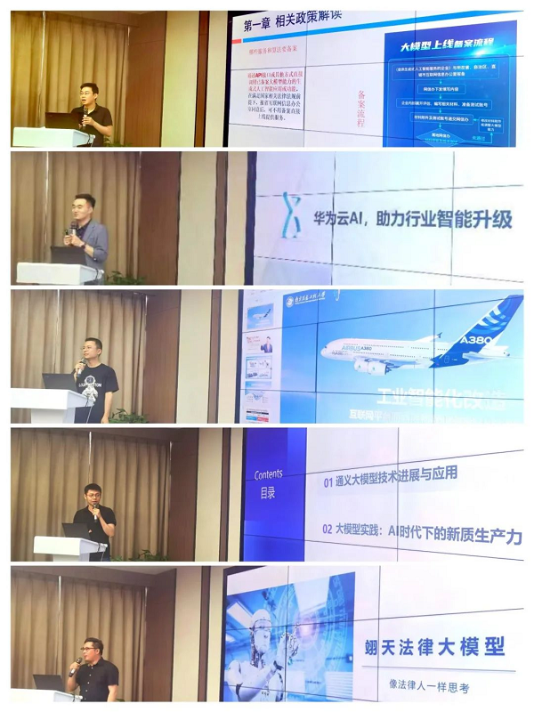 專家分享中,國家計(jì)算機(jī)網(wǎng)絡(luò)與信息安全管理中心(江蘇)信息安全處副處長趙云分享了《大模型備案相關(guān)工作介紹》,詳細(xì)介紹大模型備案相關(guān)工作的最新進(jìn)展和政策背景,幫助與會嘉賓更好地理解和應(yīng)對大模型發(fā)展的監(jiān)管要求;江蘇華為云副總經(jīng)理張燃分享《AI助力行業(yè)智能升級》,深入解析AI技術(shù)如何在各行各業(yè)中發(fā)揮關(guān)鍵作用,實(shí)現(xiàn)智能升級與變革;南京信息工程大學(xué)人工智能學(xué)院院長助理、副教授孫文赟分享《工業(yè)智能化改造:互聯(lián)網(wǎng)平臺助力質(zhì)檢領(lǐng)域智能化轉(zhuǎn)型》,展示互聯(lián)網(wǎng)平臺如何在質(zhì)檢領(lǐng)域?qū)崿F(xiàn)智能化改造,提升質(zhì)檢效率和準(zhǔn)確性;阿里巴巴集團(tuán)釘釘解決方案架構(gòu)師王洋分享《阿里云人工智能大模型能力及實(shí)踐》,展示阿里云在人工智能大模型領(lǐng)域的最新技術(shù)能力和實(shí)際應(yīng)用案例,以及在大模型技術(shù)應(yīng)用中的經(jīng)驗(yàn)和成果;圖靈微雀CEO強(qiáng)鋒分享《“翊天”法律大模型落地實(shí)踐》,展示人工智能在法律領(lǐng)域的巨大潛力和實(shí)際操作方法。