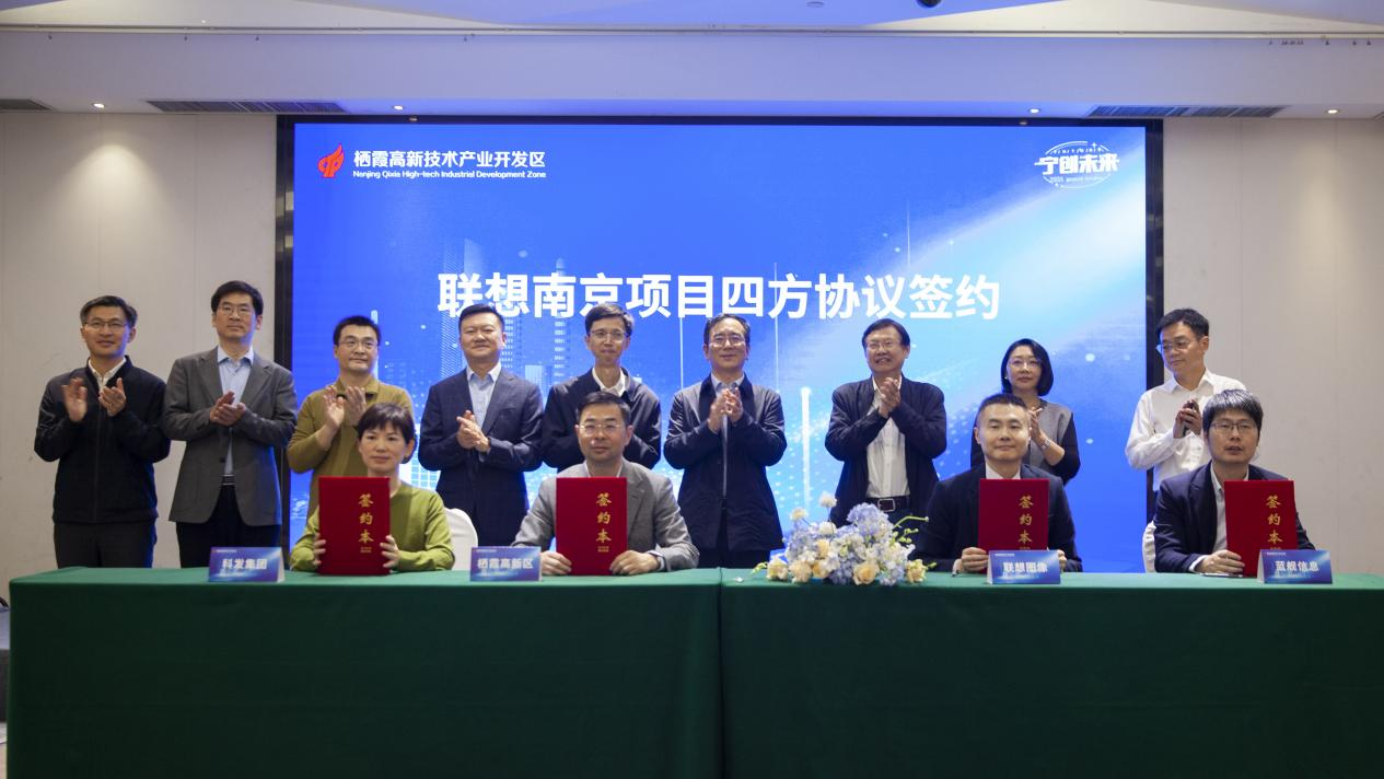 聯(lián)想圖像CEO付強(qiáng)(簽約席右二)、藍(lán)艦科技CEO余海濤(簽約席右一)、棲霞高新區(qū)管委會(huì)主任黃斌(簽約席左二)、科發(fā)集團(tuán)董事長(zhǎng)徐薇(簽約席左一)簽訂《聯(lián)想南京項(xiàng)目四方協(xié)議》。